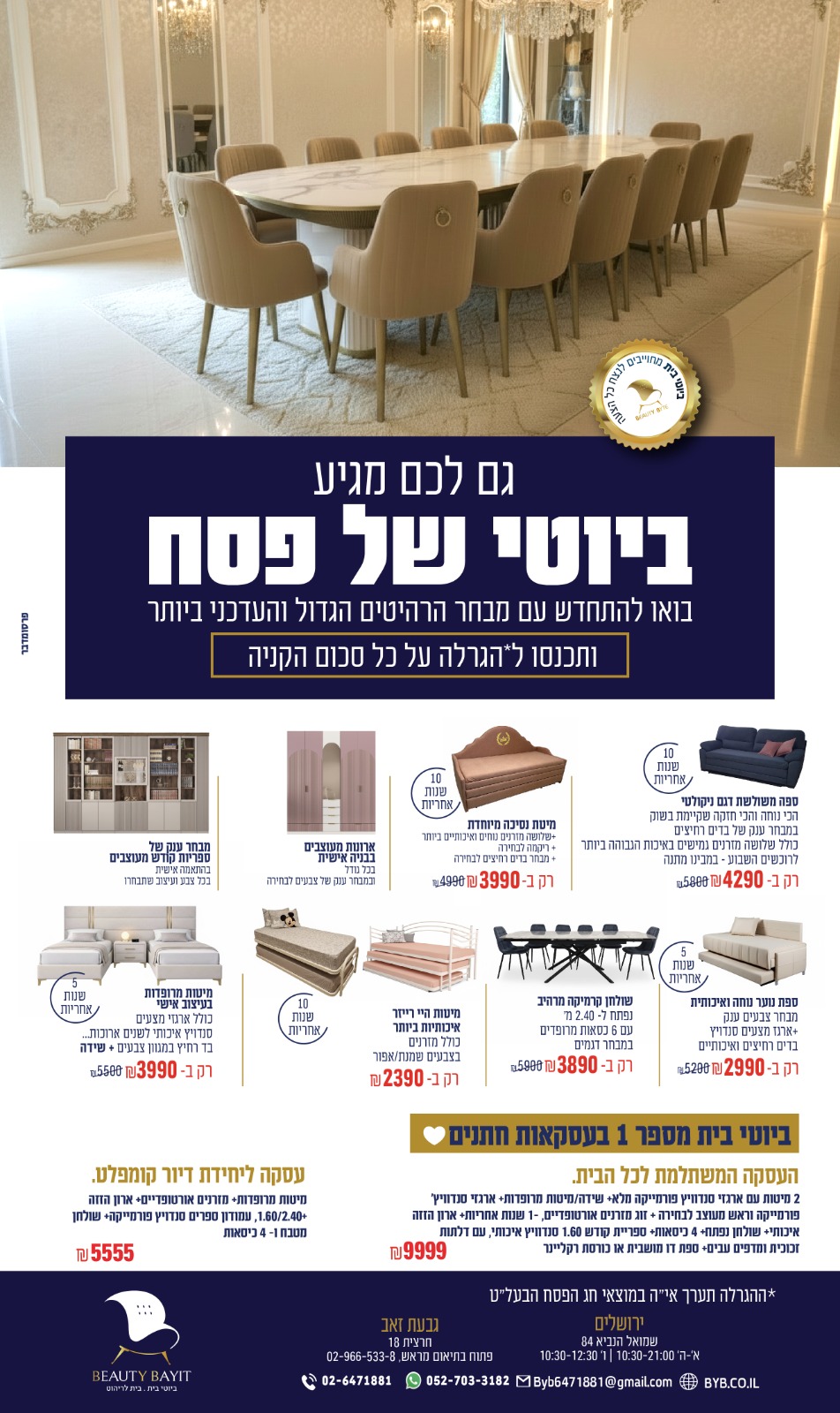 בביוטי בית, אנו מתמחים בייבוא ושיווק מגוון רחב של רהיטים לבית, מעוצבים בקפידה כדי להתאים לכל סגנון ולכל תקציב. אצלנו, תוכלו למצוא את כל מה שאתם צריכים כדי להפוך את הבית שלכם למושלם, והכל במחירים הנמוכים ביותר בארץ! ניתן להשיג אצלנו ארונות הזזה ופתיחה, חדרי שינה מעוצבים, מיטות מרופדות, חדרי ילדים, חדרי ארונות מרווחים, ארונות לפי מידה, ספות בהתאמה אישית ומבחר מזרנים אורטופדיים, כל אלו ועוד מחכים לכם במקום אחד שישדרג כל פינה בביתכם.